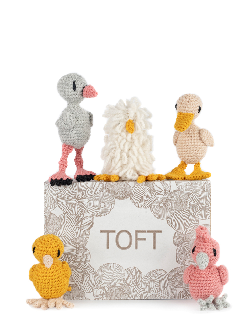 Crochet a flock of adorable baby birds with TOFT's Baby Birds Discovery Box, complete with yarn and patterns to make a baby flamingo, canary, galah, goose and chicken.