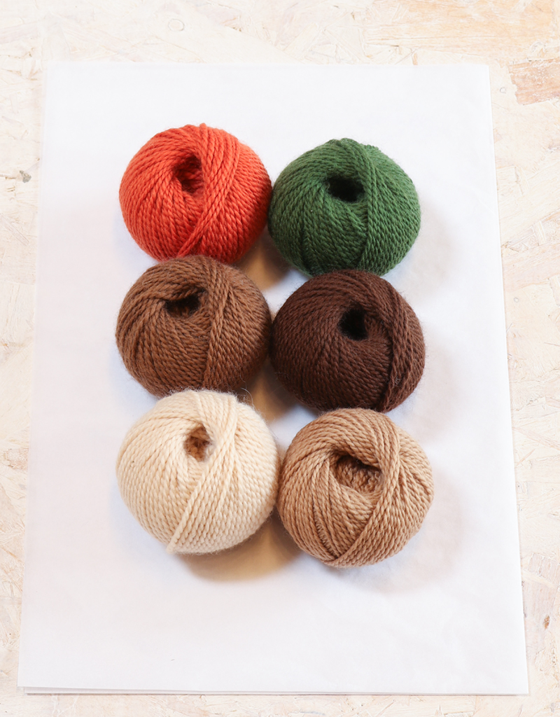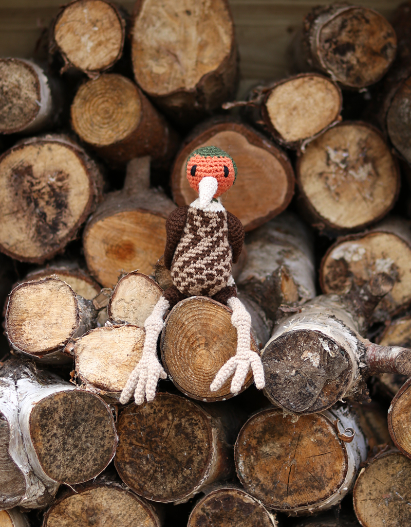 COLOUR CHOICES: This bird crochet pattern is shown here using Chestnut, Camel, Cream, Oatmeal, Stone, Orange, and Green wool.