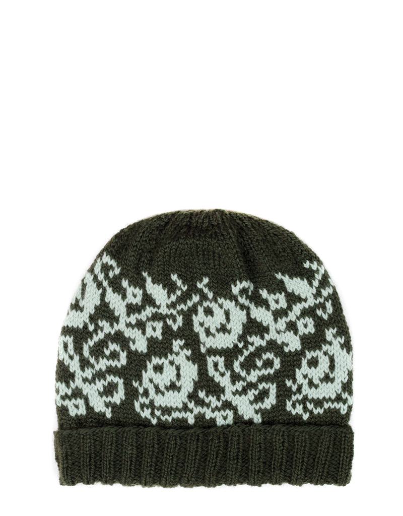 100g of TOFT's luxury DK pure wool yarn in the colours of your choice and an optional alpaca Pom Pom (shown here in Sage and Peony).