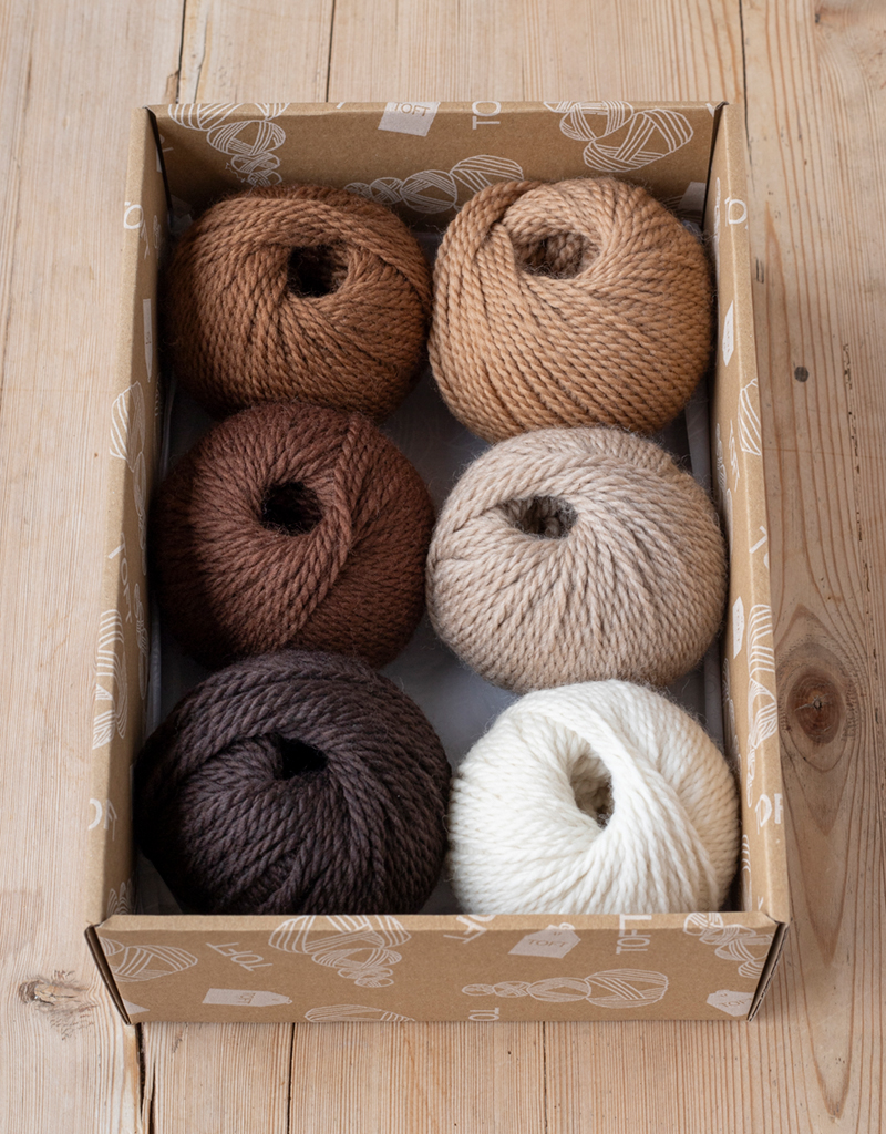 150g of TOFT's luxury DK pure wool yarn in the following colours, lengths of yarn for facial features and printed patterns to make five mini animals.