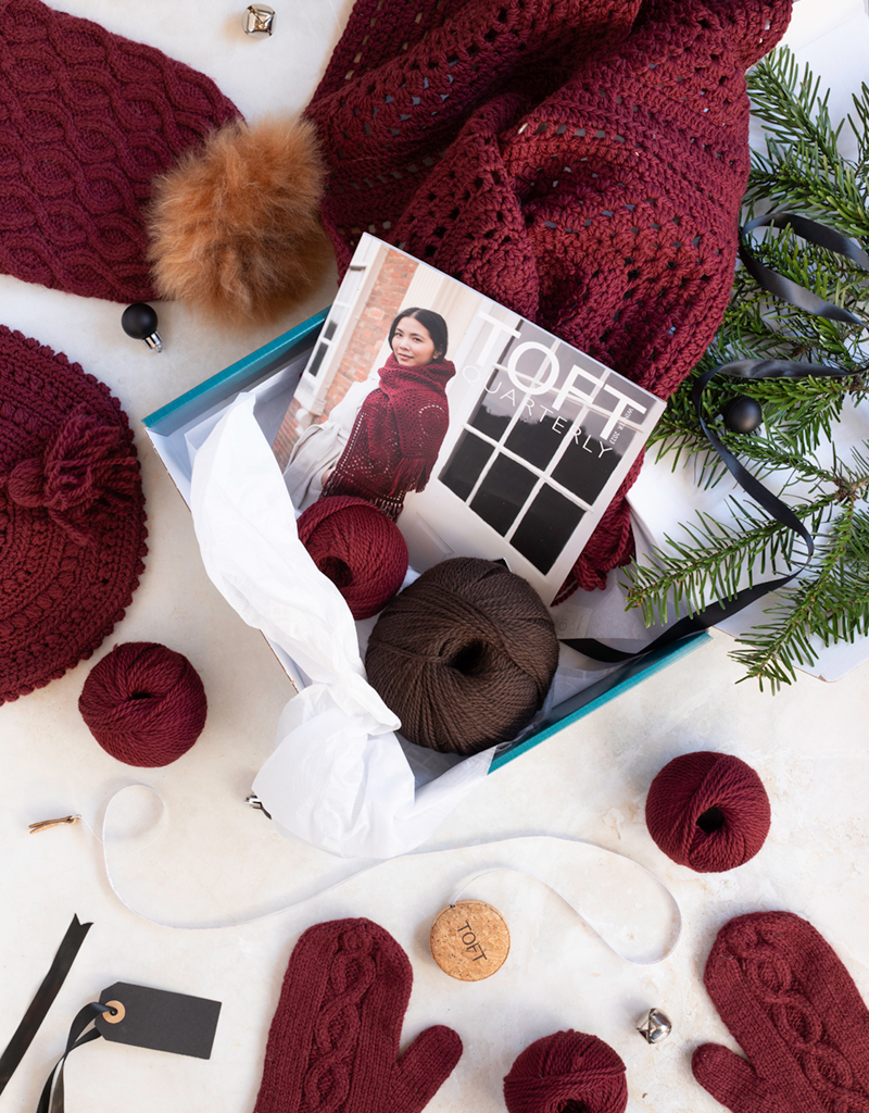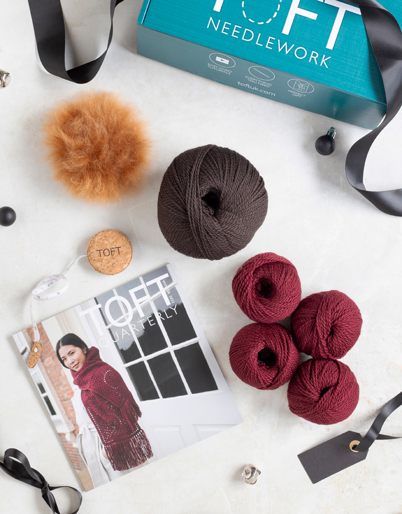 Perfect for gifting this Christmas, TOFT's Advanced Making Box contains our beautiful DK yarn in two different colours, a fluffy pom pom, a limited edition sparkle cork tape measure and a copy of TOFT's Winter 2023 pattern collection. The yarn included in the gift box is enough to make one knit or crochet hat from the magazine, or you could add it to your stash to put towards a larger project.