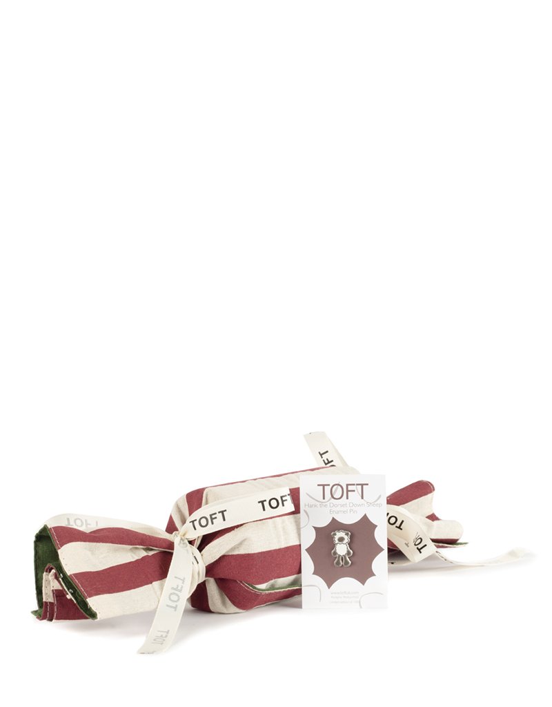 Your choice of enamel pin badge and a paper hat, wrapped up inside a reusable and reversible fabric cracker finished with 2 x TOFT ribbons and name tag.