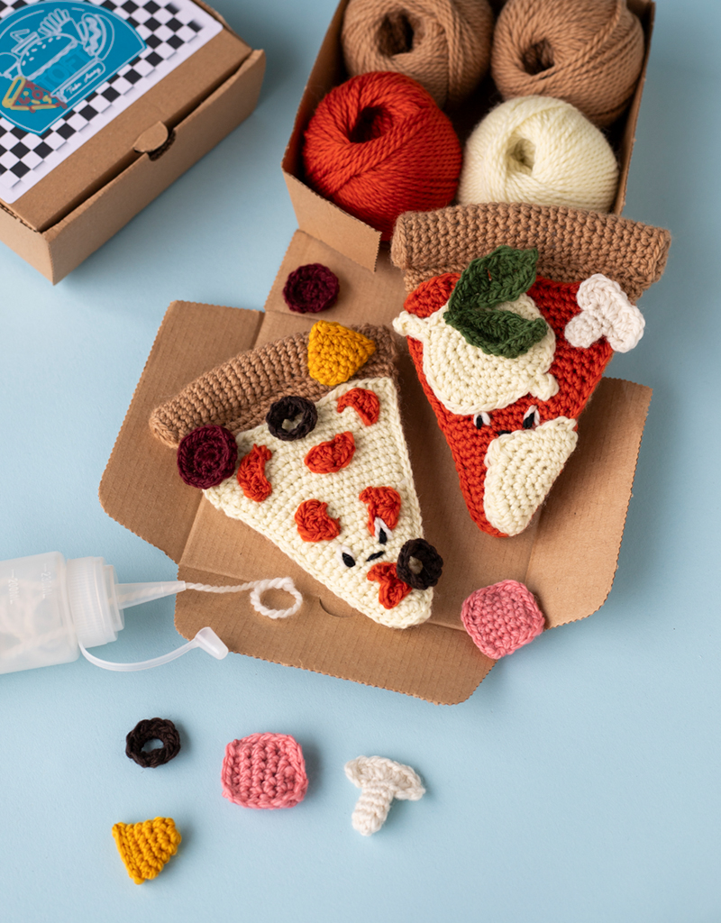 Hook up two delicious pizza slices with this crochet pattern, complete with the yarn to make a crispy base, tomato or cheese sauce, mozzarella slices, peppers and there's even the option to create a stuffed crust! For extra toppings to create your favourite flavours, don't miss the TOFT Take Away Pizza Toppings yarn bundle (sold separately).